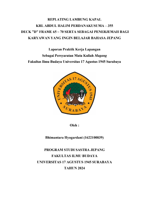 REPLATING LAMBUNG KAPAL KRI. ABDUL HALIM PERDANAKUSUMA – 355 DECK ”D” FRAME 65 ~ 70 SERTA SEBAGAI PENERJEMAH BAGI KARYAWAN YANG INGIN BELAJAR BAHASA JEPANG |
